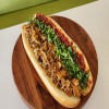 Seitan and cheez whiz served on a 12″ long roll, with your choice of add-ons like spicy cherry pepper spread (shown), fried onions (shown), lettuce (shown), ketchup, mayo, tomato. Add Sweet Potato Fries on the side for $3.50! ALLERGENS: WHEAT, COCONUT